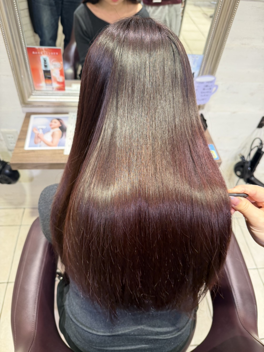 が、やっぱり薬を流すとダメージレベルの高い毛先は赤味が残らなかったのでシャンプー台で塩基性カラー剤をさっと塗って仕上げました